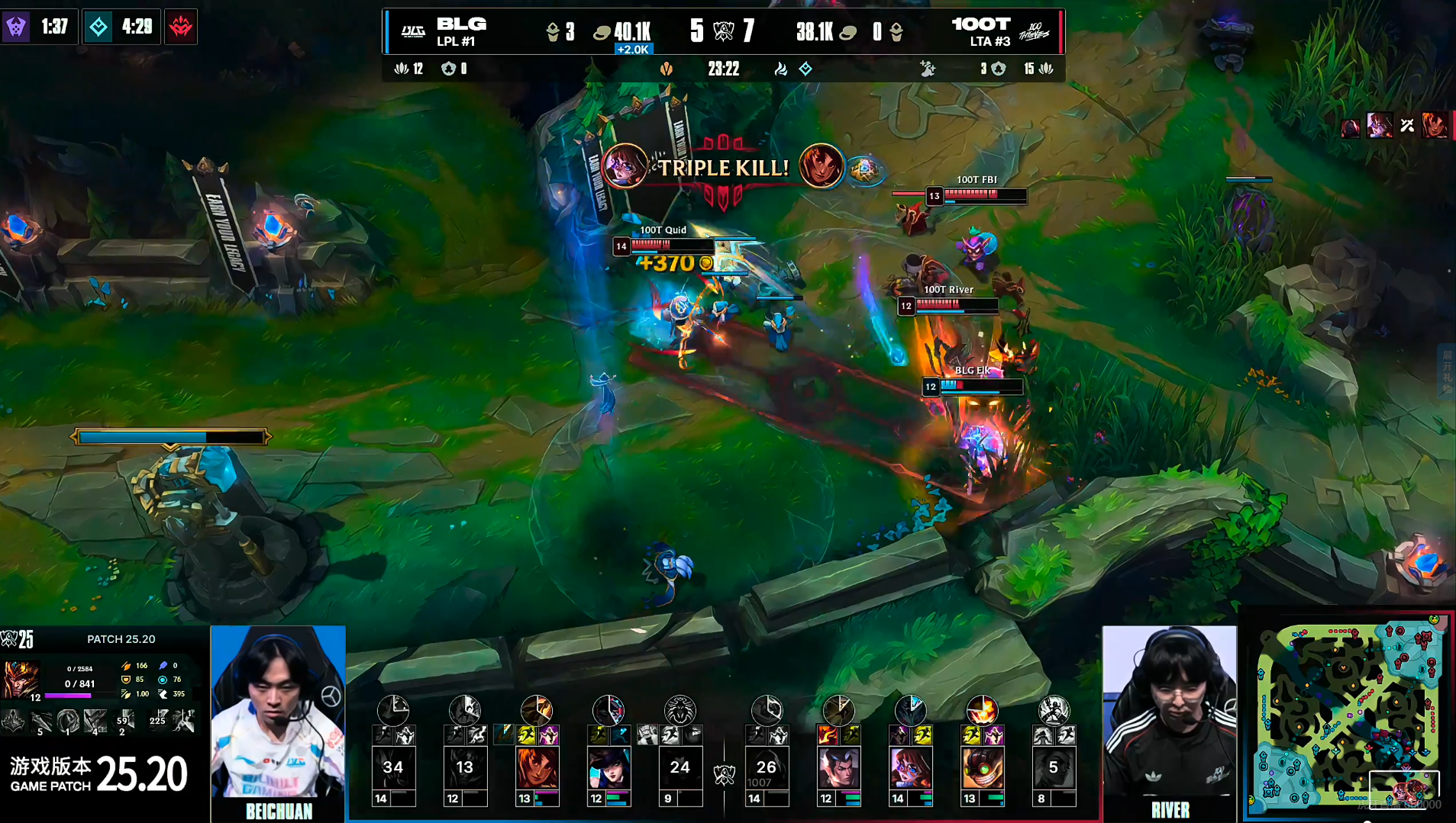 前期的小团虽然没能打赢,但BLG通过运营对线取得优势,rush掉峡谷先锋,并在17分钟撞掉100T的中一塔。BLG中期运营节奏开始起势。22分钟小龙团战,BLG不仅丢掉小龙,还被Quid阿萝拉拿到三杀,100T随后拿下厄塔汗直接撤退,BLG赶来留人,“葫芦娃救爷爷”接连送掉。